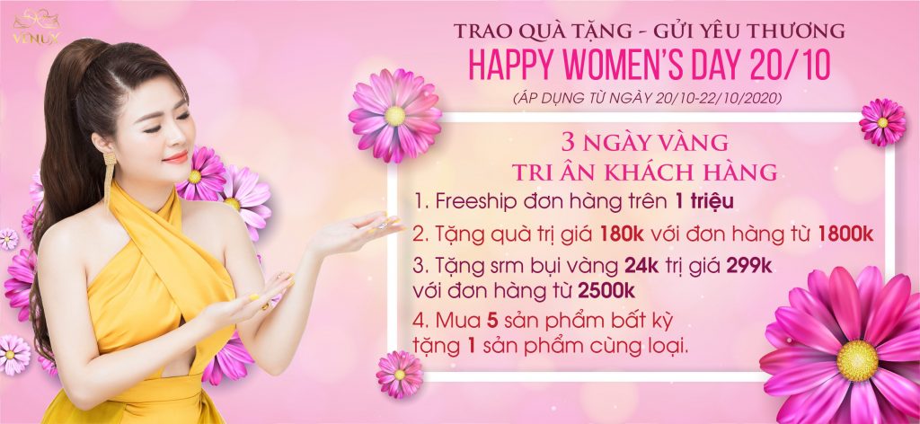 Nhân ngày Phụ nữ Việt Nam 20/10 Giang Venux xin dành những lời chúc tốt đẹp và thân thương nhất tới tất cả các chị em Phụ nữ đang sinh sống và làm việc trên toàn Thế giới luôn xinh đẹp,rạng ngời và quyến rũ. Để tri ân và đáp lại những tình cảm thân thương của mọi người dành cho mình trong suốt thời gian qua,Giang Venux xin gửi đến toàn bộ các khách hàng CTKM trong “ 3 NGÀY VÀNG”,cụ thể như sau: