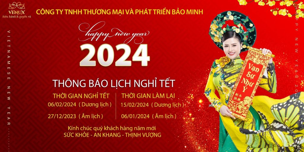 Có thể là hình ảnh về 1 người và văn bản cho biết 'VENUX kiêu hãnh& quyến CÔNGT TNHH THƯƠNG MẠI VÀ PHÁT TRIỂN BẢO MINH Chappy new year 2024 THÔNG BÁO LỊCH NGHỈ TẾT THỜI GIAN NGHỈ TẾT THỜI GIAN LÀM LẠI 06/02/2024 (Dương lịch) 15/02/2024 (Dương lịch 27/12/2023 (Âm lịch) Van Sự Như 06/01/2024 (Âm lịch Kính chúc quý khách hàng năm mới SỨC KHỎE AN KHANG THỊNH VƯỢNG'